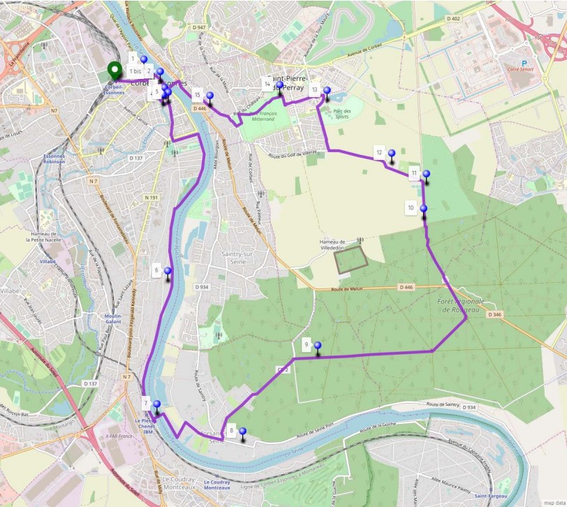 Boucle 20 km au départ de la gare de Corbeil-Essonnes.Ainsi, découvrez successivement le riche patrimoine culturel et industriel du confluent de l’Essonne et de la Seine. Par la suite, vous pourrez bénéficier du calme des futaies de chênes centenaires de la forêt de Rougeau, le long de l’Allée royale. Pour finir, n’hésitez pas à observer les contrastes du patrimoine moderne et ancien de St Pierre-du-Perray.