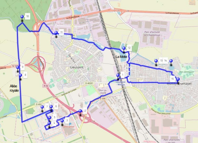 Boucle de 17 km au départ de la gare de Lieusaint-Moissy. Une balade quasi plate, presqu’entièrement sur voies vertes et pistes cyclables. Découvrez autrement qu’en voiture le Carré Sénart, centre commercial et administratif de la ville nouvelle de Sénart. Laissez vous charmer par de grandes fermes briardes insérées dans cette ville nouvelle. Et n’oubliez pas l’Allée royale, le ru des Hauldres, et la zone humide de l’espace naturel de la Motte, riche en oiseaux.