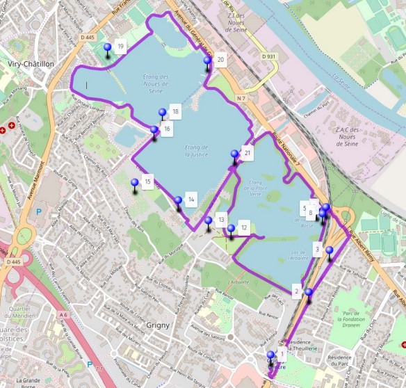 Les lacs de l’Essonne, à Grigny. Ces 6 anciennes gravières reliées entre elles et constituent près de 100 h de plans d’eau. Il s’agit en effet d’un espace remarquable sur le plan du panorama. Profitez de la qualité de la promenade, et de l’observation des oiseaux. On pourra être sensible à la longue histoire des atteintes à l’environnement dans la région au cours du XX° siècle, de l’étonnante capacité de récupération de la biodiversité. On est témoin de son équilibre toujours fragile.