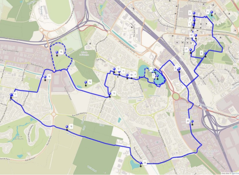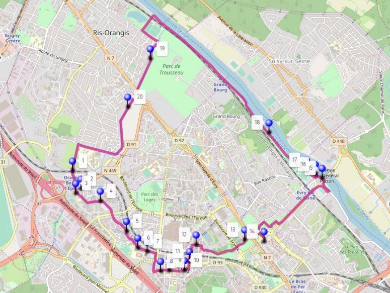Courcouronnes, Bondoufle et Lisses. Cette boucle de 17 km au départ de la gare d’Evry-Courcouronnes vous fera passer par le cœur des petits villages agricoles qu’étaient encore Courcouronnes et Bondoufle il y a 50 ans. Contrastant avec les différents faciès de la ville nouvelle sortie de terre dans les années 70, et aussi par des parcs artificiels où la nature a vite repris ses droits. Vous oublierez par moment que vous êtes au milieu de la ville…